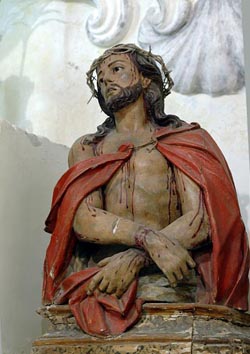 All’interno delle cappelle vi sono posti S. Antonio da Padova, l’Angelo Custode, l’Ecce Homo, il Crocifisso, la Sacra Famiglia, il fonte battesimale; mentre il gruppo scultoreo dei due vecchioni è sistemato sul lato destro dell’abside di fonte all’organo. |